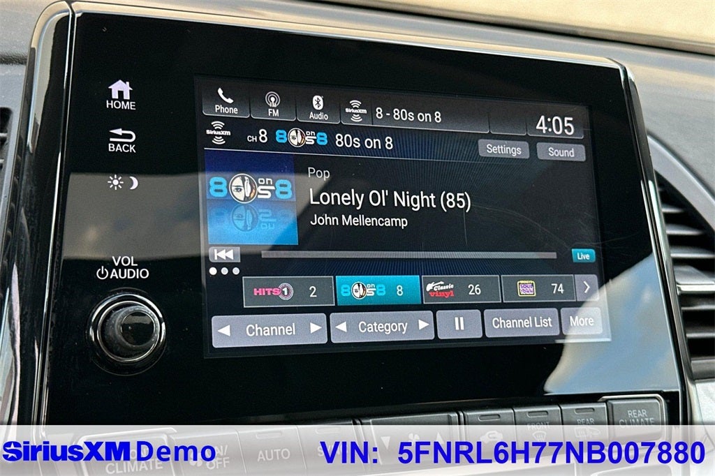 - Radio: 160-Watt AM/FM/HD/SiriusXM Audio System -inc: 7 speakers including subwoofer, Speed-Sensitive Volume Compensation (SVC), Bluetooth® HandsFreeLink, Bluetooth® streaming audio, MP3/auxiliary input jack, Radio Data System (RDS), SMS text message function, 2.5-amp USB audio interface port in center console, 2.5-amp USB charging port in front console, (2) 2.5-amp USB charging ports in second row, CabinControl remote compatibility, 8" display audio w/high-resolution electrostatic touch-screen and customizable feature settings, HondaLink, Apple CarPlay, Android Auto, illuminated steering wheel-mounted audio controls and black fin-type roof-mounted antenna, All SiriusXM services require a subscription, sold separately by SiriusXM after the trial period, If you decide to continue service, the plan you choose will automatically renew at the then-current rates, Fees and taxes apply, See the SiriusXM Customer Agreement & Privacy Policy at www.siriusxm.com for full terms and how to cancel, which includes calling 1-866-635-2349, Available in the 48 contiguous U.S, and D.C, Some services and features are subject to device capabilities and location restrictions, All fees, content and features are subject to change, SiriusXM, Pandora and all related logos are trademarks of Sirius XM Radio Inc, and its respective subsidiaries