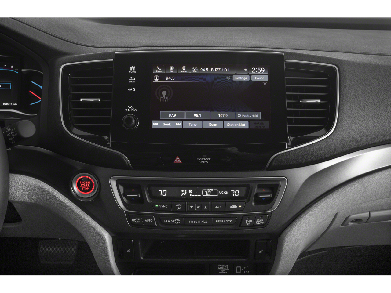 - Radio: 215-Watt Audio System -inc: 7 speakers, subwoofer, Bluetooth® HandsFreeLink and streaming audio, MP3/auxiliary input jack, Radio Data System (RDS), Speed-sensitive Volume Compensation (SVC), 2.5-amp USB charging port (1 port in center console/2 ports on 2nd-row), 8" display audio w/high-resolution touch-screen and customizable feature settings, HondaLink, CabinControl remote compatibility, Apple CarPlay integration, Android Auto integration, SMS text message function, SiriusXM (SiriusXM requires a subscription after any trial period, If you decide to continue your SiriusXM service at the end of your trial subscription, the plan you choose will automatically renew and bill at then-current rates until you call SiriusXM at 1-866-635-2349 to cancel, See our customer agreement for complete terms at www.siriusxm.com, Fees and programming subject to change, Available in the 48 contiguous United States and D.C, SiriusXM and all related marks and logos are trademarks of SiriusXM Radio Inc.), HD radio and 2.5-amp USB smartphone/audio interface (1 port in front console)